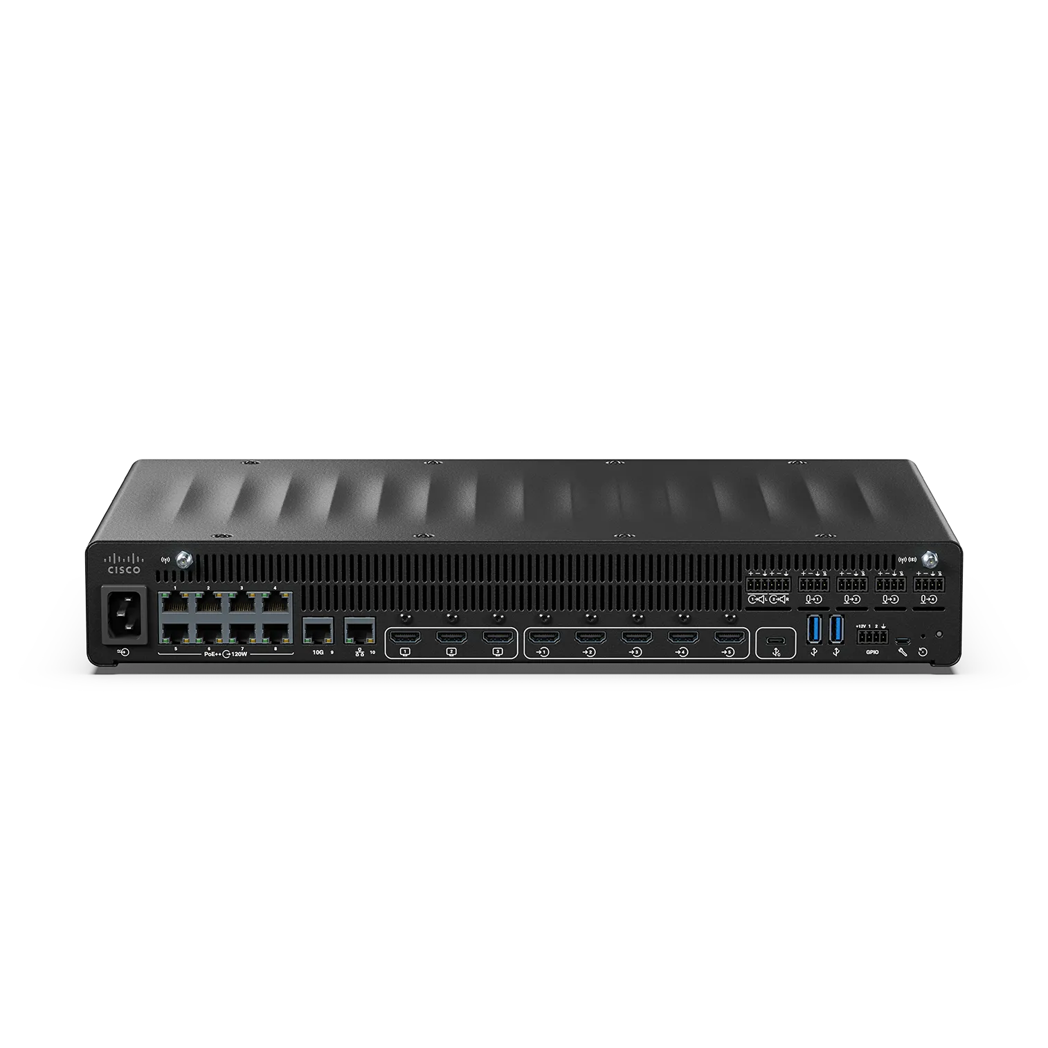 8x 1G PoE+ with 120W total budget, 1x 10G Ethernet (extensible with switch). AVoIP capacity |