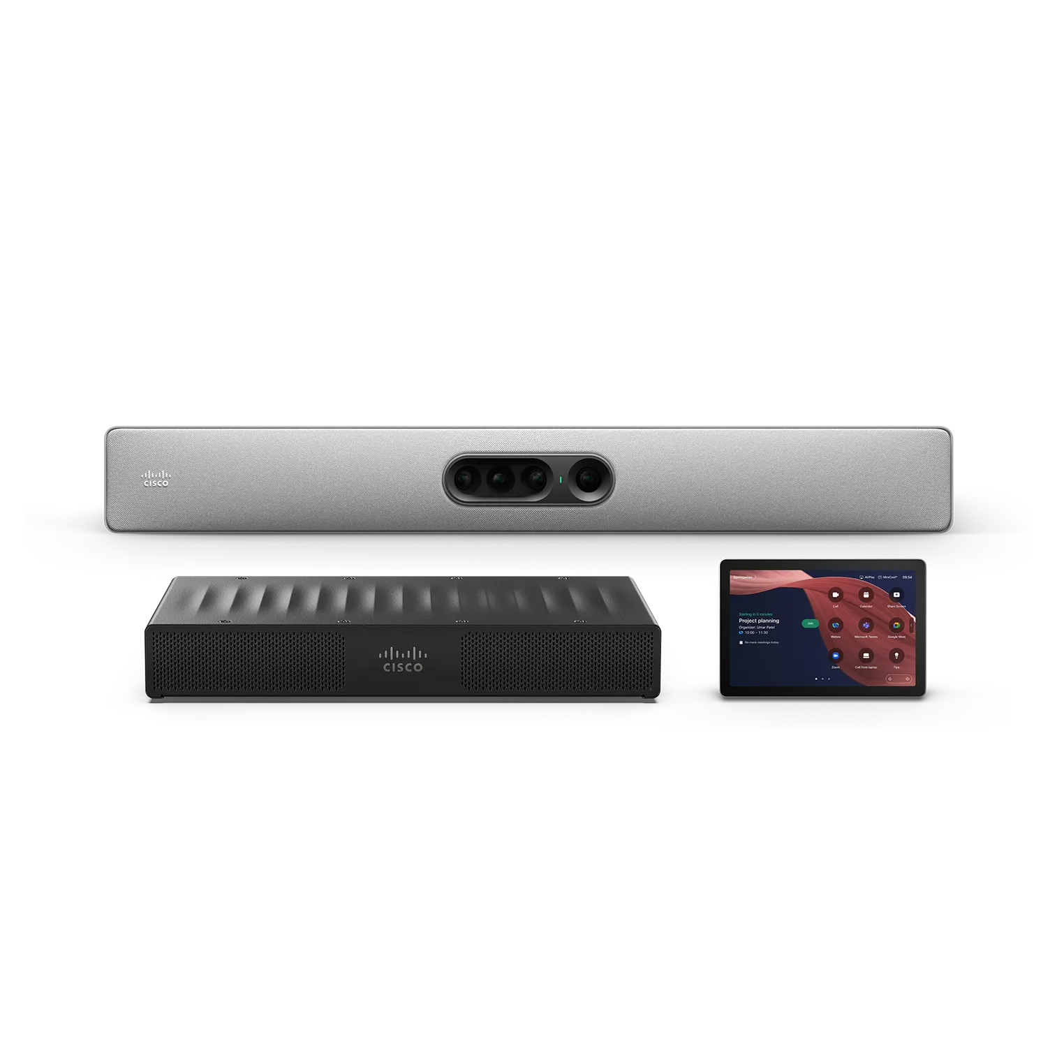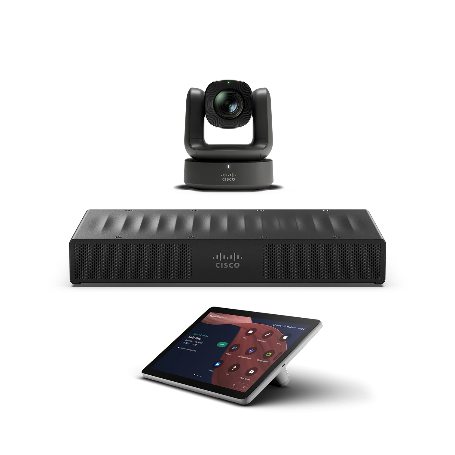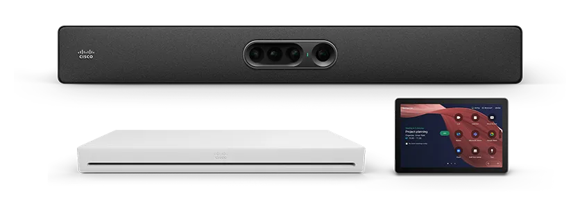 Modular room kit appliance with a standalone conferencing camera, room codec, and touch controller. Form factor |