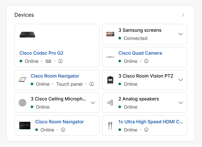 Gone are the days of multi-vendor external DSPs, messy cabling, adapter jigsaws, and power drop chaos. The Room Kit Pro G2 brings unparalleled Power over Ethernet (PoE) capacity to connect, control, and power your room peripherals while allowing for seamless scaling to support your rooms as they evolve, without costly redesigns or duct-tape fixes.