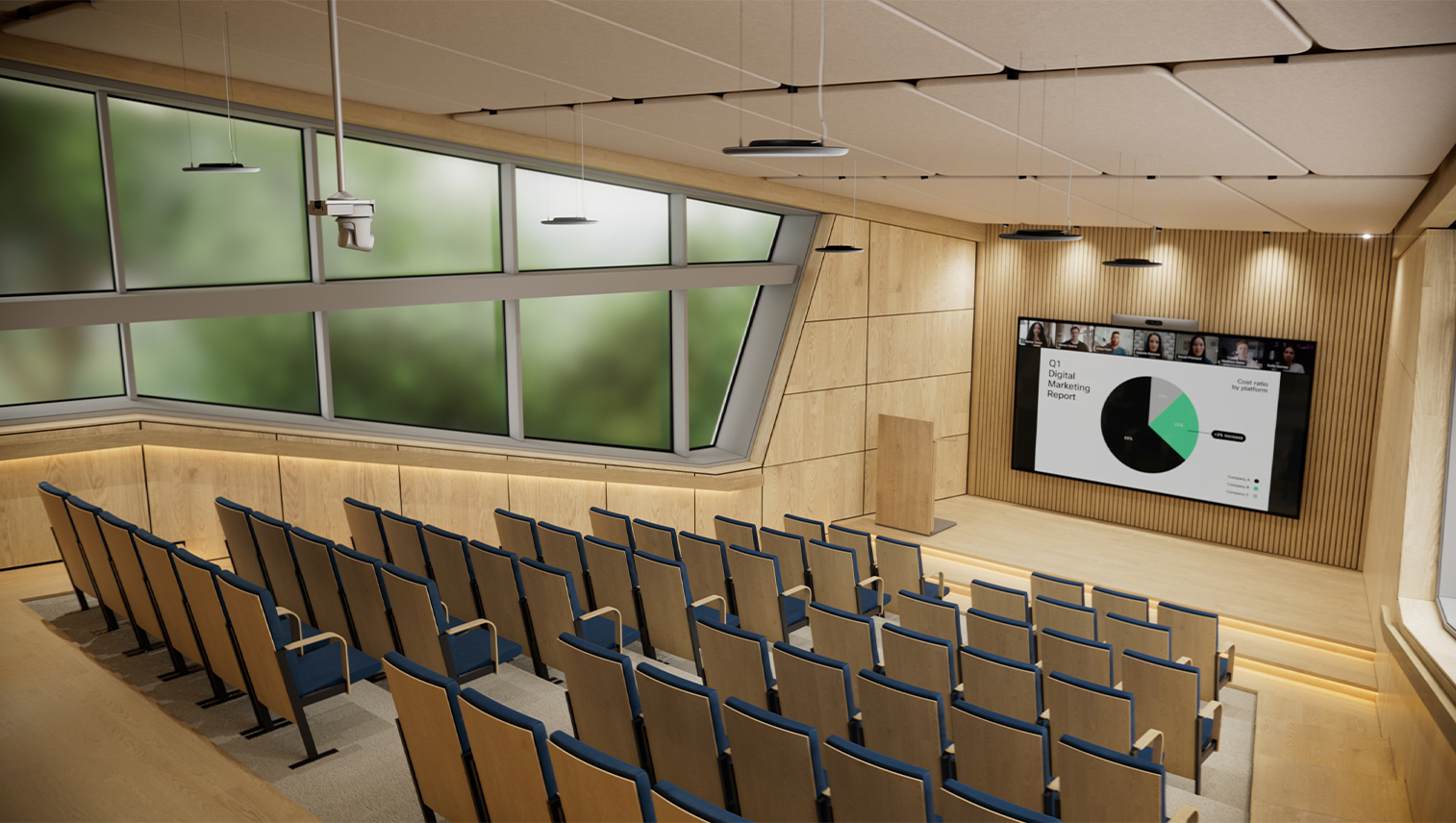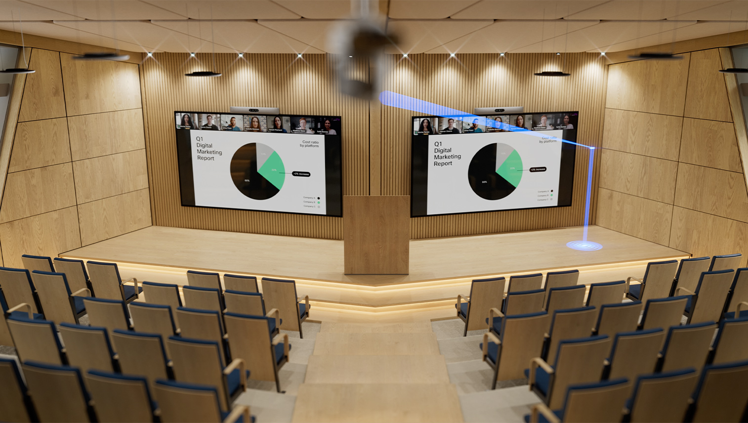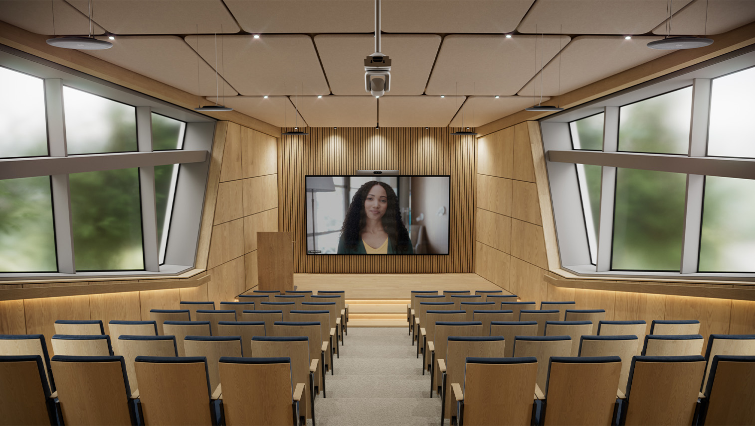 A classroom-style composition combined with multiple screens and a quad-lens camera system offers an optimal blueprint for local, remote, and hybrid presentations.