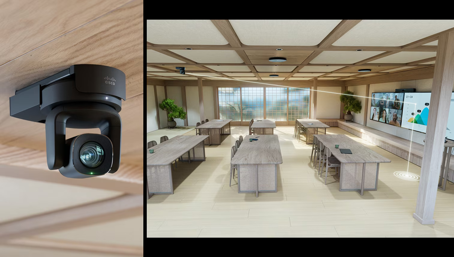 With the latest generation of flexible, plug-and-play IP-based directional microphones, both presenters and the in-room audience can be confident that their voices are heard clearly. Eight adaptive microphone beams work together with advanced AI to automatically follow room dynamics and pick up high-fidelity voice from the active presenters or the audience while blocking out excess noise from other parts of the room. And thanks to adaptive beamforming, there’s no need to reconfigure the microphones manually when the table arrangement or room furniture design changes.