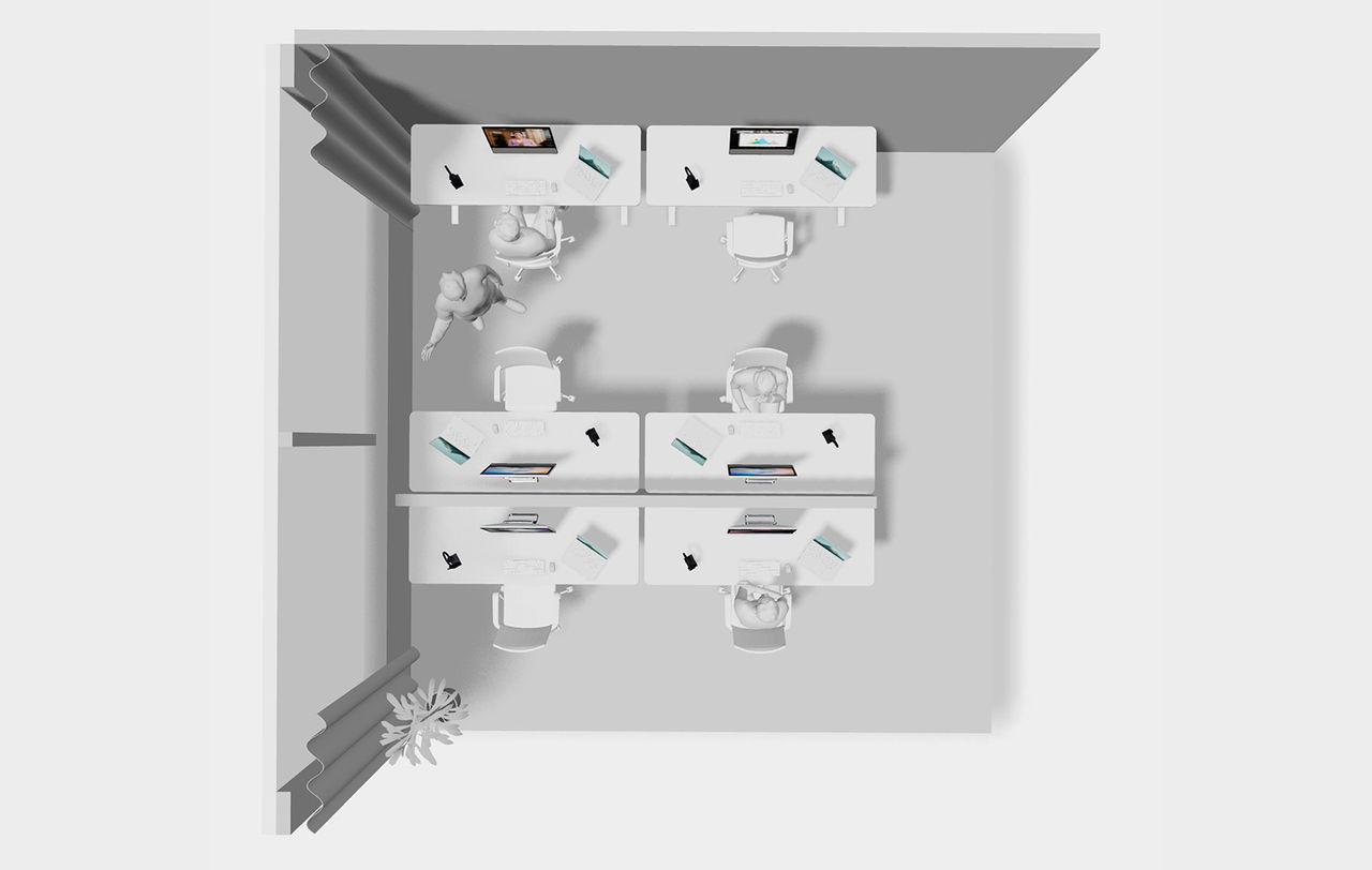 The right furniture and interior design make all the difference. Ensuring the right colors combined with comfortable furniture will keep employees productive. Allow users to easily navigate and find their space for the day by making sure all components are setup in the right place in the room. If video is deployed, we recommend ensuring the correct distance from the camera to the floor and the camera to the user.